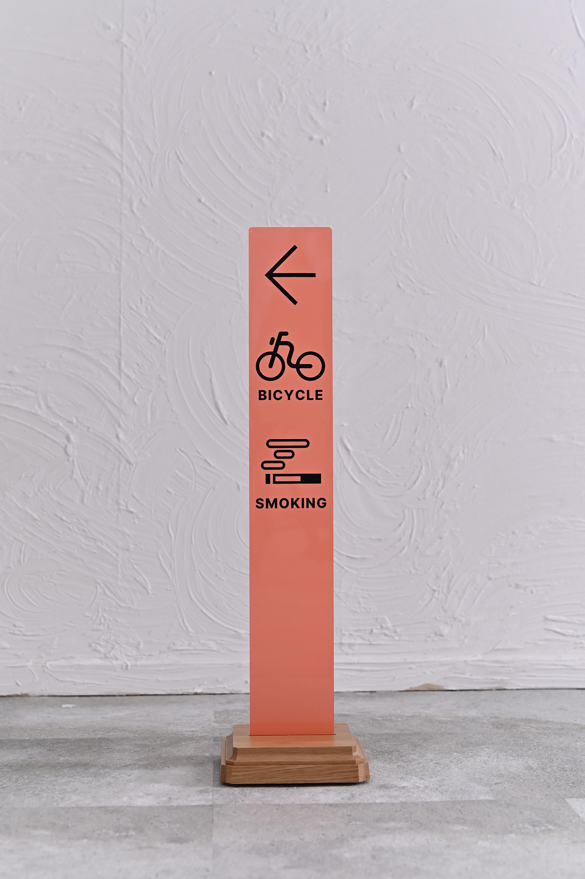 ハンドメイドの台座とビビットカラーの組み合わせで軒先や店内にオブジェのような案内板